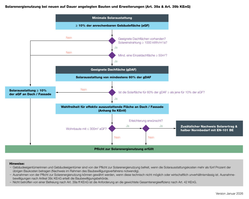 Im Kanton Bern gelten seit dem 01. Januar 2026 neue Vorschriften zur Solarpflicht für Neubauten und Erweiterungen sowie für Parkplätze. Nachzulesen auch in den Artikeln 39a und 39b des Kantonalen Energiegesetzes. Der Kanton Bern hat dazu ein Ablaufschema erstellt, um herauszufinden, welcher Anteil der neu errichteten Dachfläche mindestens mit Solarenergienutzung auszustatten ist.
