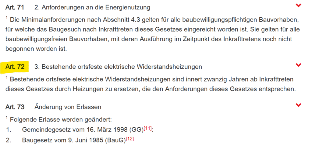 La loi cantonale sur l'énergie stipule que tous les systèmes de chauffage électriques existants doivent être remplacés par des systèmes de chauffage renouvelables d'ici fin 2031. L'obligation de remplacement concerne les systèmes de chauffage électriques centraux à accumulation, les poêles électriques décentralisés installés dans chaque pièce et les panneaux infrarouges.